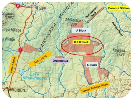 Owhaoko B&D blocks are landlocked and only accessible by helicopter. Hunting and recreational groups are flown in from the Helisika base operations near Poronui Lodge, Taharua road off the Taupo-Napier highway.